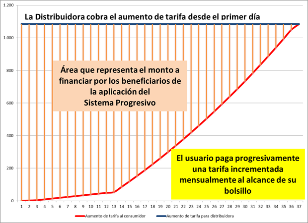 Esencialmente ¿en qué consiste esta manera progresiva de aumento al público a la vez que las compañías cobran el 100% inmediatamente? Asumamos que hoy un hogar paga $180 de luz y mañana debería pagar $1.260, el gobierno debe calcular una tarifa incrementada mensualmente para que en un tiempo de 3 años ese hogar vaya pagando un poco más de los $180 y vaya saldando la deuda de no haber pagado toda la tarifa de una sola vez y desde el principio. ¿Quiénes aportarán el capital necesario para financiar estos montos? Los mismos que se benefician con el aumento de tarifas: las compañías de distribución eléctrica por el citado aumento; los socios de estas compañías por la mayor rentabilidad; los bancos que financian a estas distribuidoras por un nuevo negocio financiero; las compañías de seguros que disminuyen su riesgo tanto con las distribuidoras como con los bancos que les prestan;  el gobierno por la estabilidad social y porque disminuye subsidios.